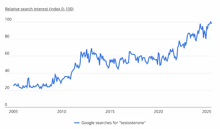 Interest declined in 2014, coinciding with an FDA warning about potential cardiovascular risks linked to testosterone therapy and a mandate for updated product labeling. In the years that followed, testosterone-related searches remained largely stagnant.
